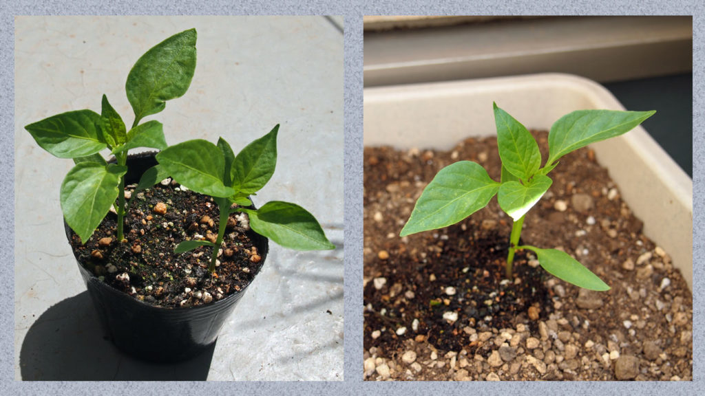 発芽から約27日後には、下の写真左のようにホームセンターで売られている苗と同じくらいに育ちました。この間、1つの苗ポットに2本になるよう数回の間引きを行いました。1つの苗ポットで育った2本のうち、生育の良い苗を1つ選びプランターに植えました(下の写真右)。