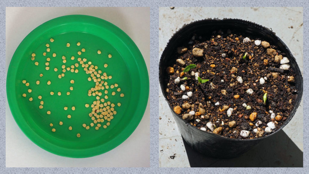 その種(下の写真右)を桜が咲く頃に苗ポットに蒔きました。種を蒔いてから約20日後に発芽が観察されました(下の写真左)。