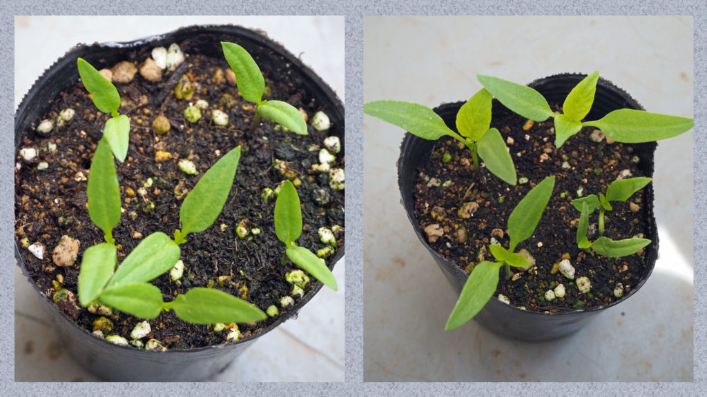 発芽を観察してから約8日後に双葉の状態になり(下の写真左)、約14日後に下の写真右のような本葉が出始めました。