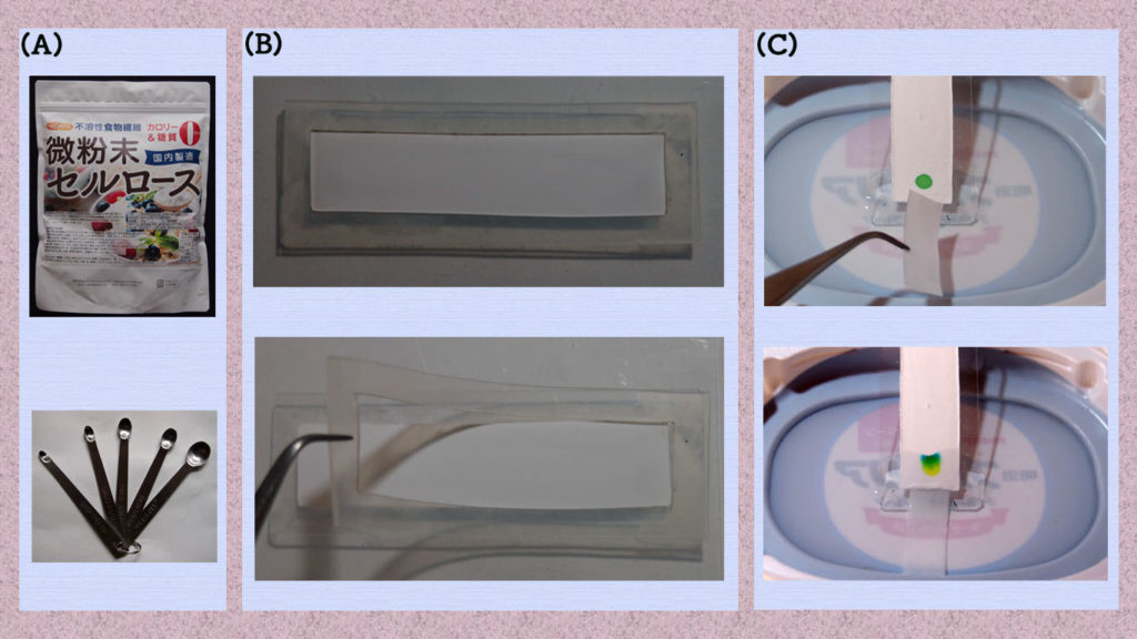 下の写真の(A)の左は、水で溶いたセルロースパウダーで作製したTLCプレートで食紅を展開した結果です。(A)の右は、後述する方法で再構成した結果です。