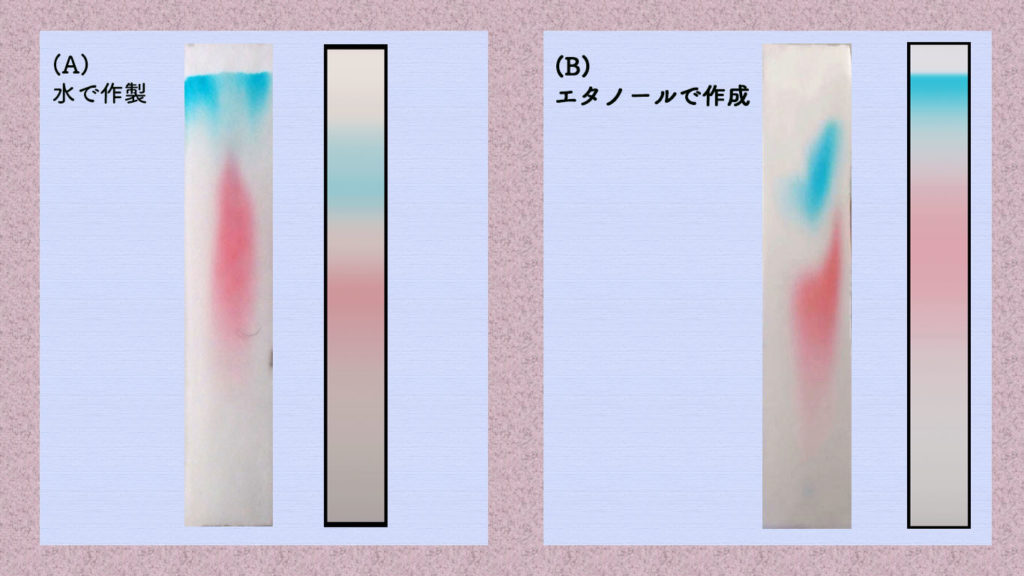 両方とも「水とエタノールで作製したTLCプレート」とは異なり、「食用色素 赤」の方が「食用色素 青」より移動度が大きい結果となりました。これは、ペーパークロマトグラフィーのコーヒーフィルターのメリタブラウンと同じ結果です。