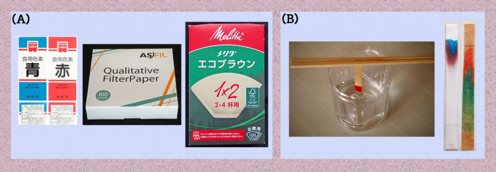 濾紙やコーヒーフィルターでペーパークロマトグラフィーの実験をしたとき、担体(濾紙、コーヒーフィルター)の違いで食紅の移動度が異なること(下の写真(B)右)を「コーヒーのペーパーフィルターの違いを食紅で調べてみました」で紹介しました。ペーパークロマトグラフィーの担体は、濾紙とメリタエコブラウンです(下の写真(A))。