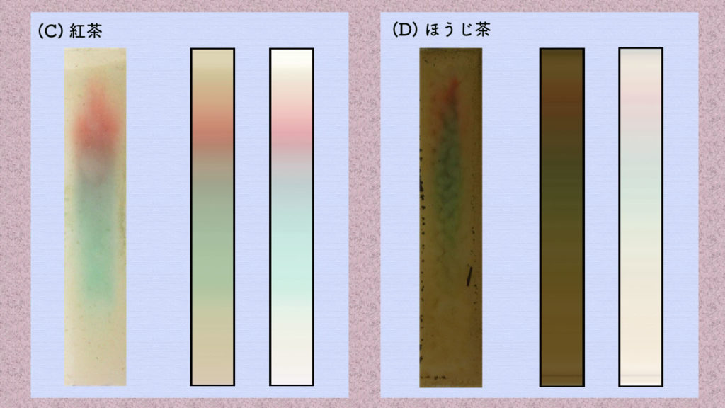 緑茶の結果は、紅茶やほうじ茶と同様に「食用色素 赤」の方が「食用色素 青」より移動度が大きい結果となりました。