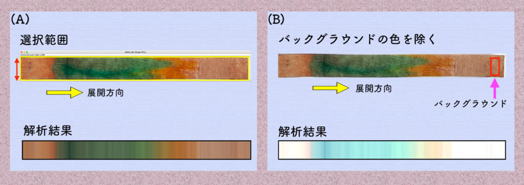 色のついた担体のバックグラウンドを除くため、下の写真(B)上の赤四角の部分のR-,G-,B-チャンネルの値を用います。下の写真(B)下がその結果です。