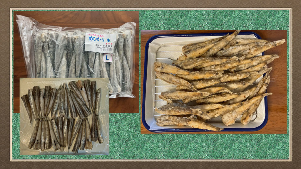 下の写真左側は、戸田から取り寄せた冷凍品を解凍したものです。写真の右側は、駅ビル地下の魚屋さんで生のメヒカリが売っていたので迷わず購入したものです。